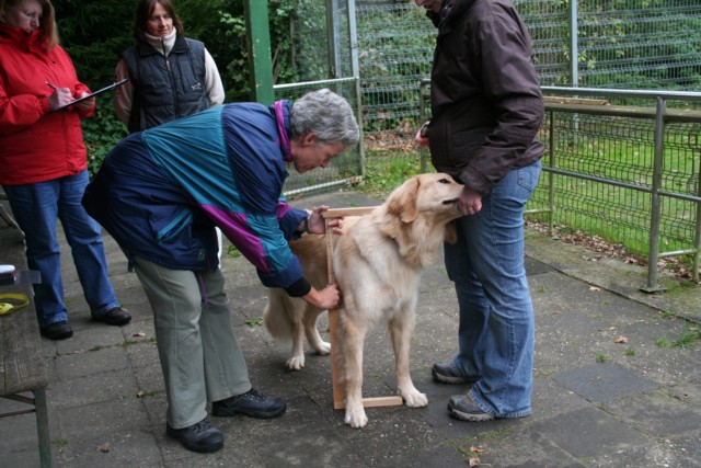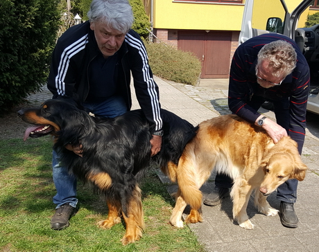 Aber was tut ein Züchter nicht alles, um die Nachkommen seiner Hündin mit den bestmöglichen Genen auszustatten. Die weite Fahrt hat sich gelohnt. Boumer ist bildschön: Korrekte Rute, korrekte Ohren, goldblonde perfekte Marken, ideale Größe und Statur. Wirklich ein Champion.