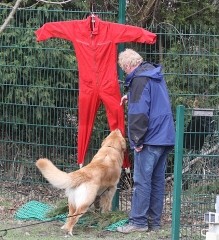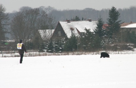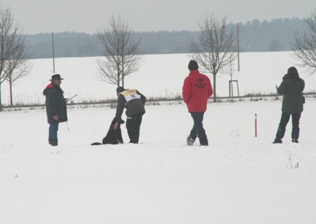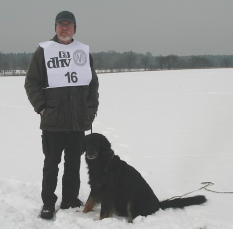 Mit einem mulmigen Gefühl meldete sich Reinhard mit Felina am Samstag um 11.40 h an. In der Nacht hatte es gefroren und es war lausig kalt. Felina suchte zunächst konzentriert mit tiefer Nase, arbeitete die Winkel gut aus, wurde danach aber flüchtiger und wechselte auch das Tempo. Die meisten Punkte verlor sie aber an den Gegenständen, weil sie sich oft nur zögerlich hinsetzte - igitt, ist der Schnee kalt - doch sie erreichte das Ziel: 87 Punkte verkündete Richter Fricke. Uns fiel ein Stein vom Herzen. Anderes Gelände, neues Glück: Willi mit Roland zeigte eine Vorführung, die absolut Spitze war: mit tiefer Nase, gleichmäßig im Tempo, sicher in den Winkeln, schnell und ohne Beanstandung beim Verweisen: 100 Punkte, ein Traumergebnis, aber was nützte es, beide Prüfungen mussten halt bestanden sein.