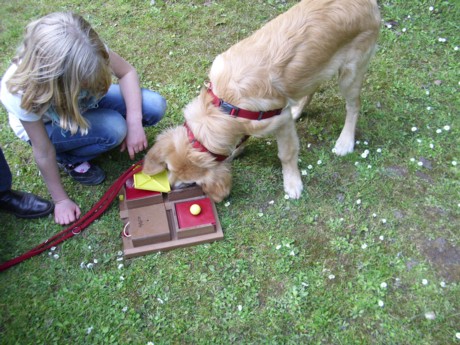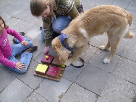 Nicht nur Kinder, auch Welpen müssen lernen, mit ORFFschen Instrumenten richtig umzugehen: