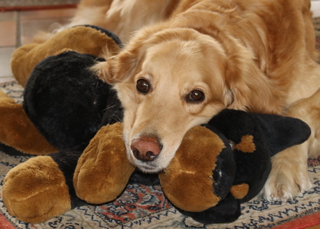 Nach der ersten haben wir noch eine weitere Ultraschalluntersuchung machen lassen. Dabei haben wir genauer gezählt. Es werden doch mehr Welpen. Und da es jetzt etliche Welpen werden, übt sich Milva schon mal im Kuscheln: