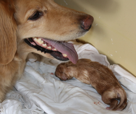 Der Erstgeborene (Rüde) unmittelbar nach der Geburt: