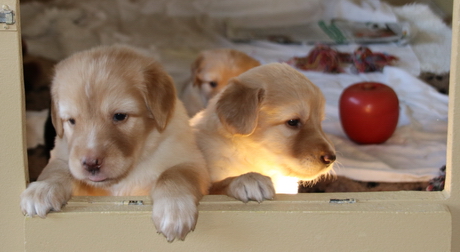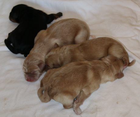 Milva hatte es eilig. Am 6.6.2019 nachmittags in nur zweieinhalb Stunden erblickten vier gesunde Welpen das Tageslicht: Zwei blonde Rüden und, zu unserer großen Freude, eine blonde und eine schwarz-markenfarbige Hündin. Alla vier sehr kräftig und agil und sofort auf der Suche nach der Milchquelle.Milva geht es super. Sie ist eine hingebungsvolle und fürsorglich Mutter und putzt eifrig ihre Kinder.