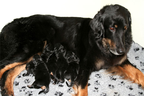 Felina ist eine schöne schwarzmarkenfarbene Hündin, temperamentvoll, arbeitsfreudig, aber auch anhänglich und verschmust. Sie setzt die Tradition derer "vom Büssemfeld" in vierter Generation fort. Felina ist auch die Mutter des H-Wurfes und des I-Wurfes.