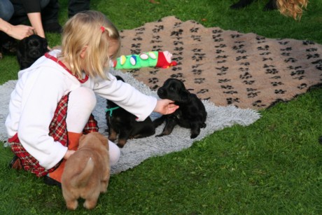 Es erfreut jeden Züchter, wenn er seine ehemalige Welpenschar bei einer Nachzuchtbeurteilung fast vollzählig wiedersieht. Ein Dank an alle Frauchen und Herrchen, dass sie ihre Lieblinge den gestrengen Augen der Körmeisterin vorgestellt haben. Ein Dankeschön geht auch an Birgit und Bernd, die den weiten Weg von Neumarkt in der Oberpfalz nicht scheuten, um mit Vater Cliff das Bild Vater-Mutter-Kinder zu vervollständigen.