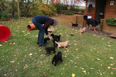 Die Zuchtwartin Angela Beem waltet ihres Amtes bei der Zwischabnahme, beobachtet die Welpen und nimmt mit ihnen Kontakt auf: Die Welpen sind altersgemäß korrekt entwickelt. Kiefer und Ruten sind in Ordnung. "Die Hündin ist in hervorragendem Zustand." (Zitat aus der Beurteilung)