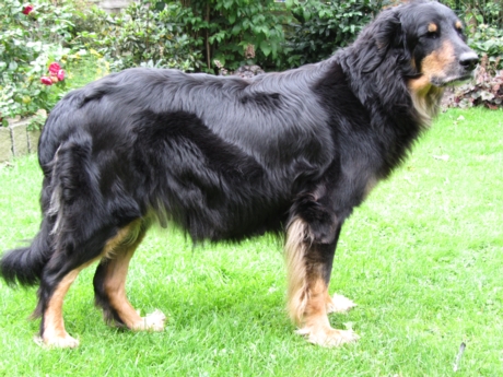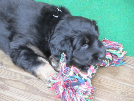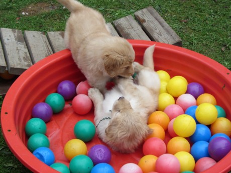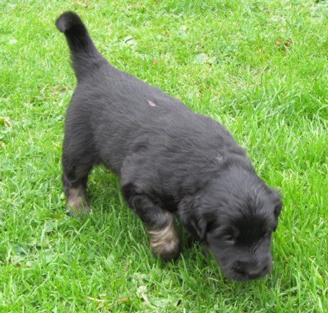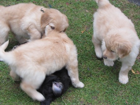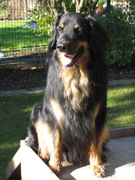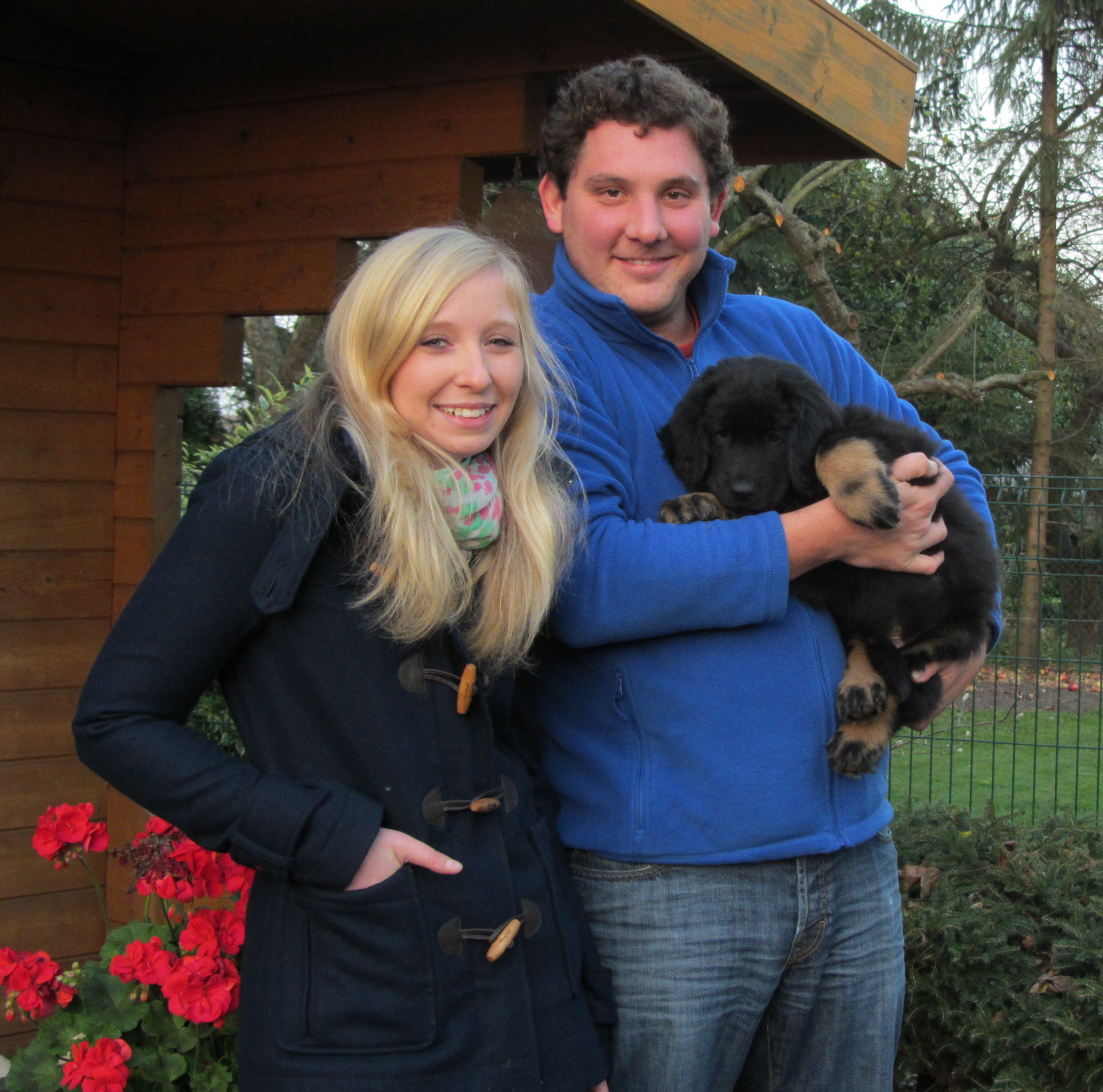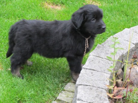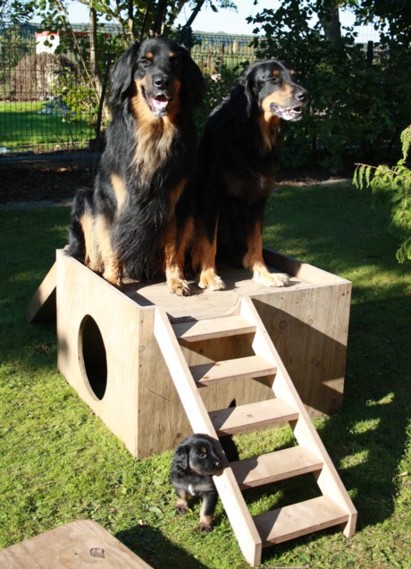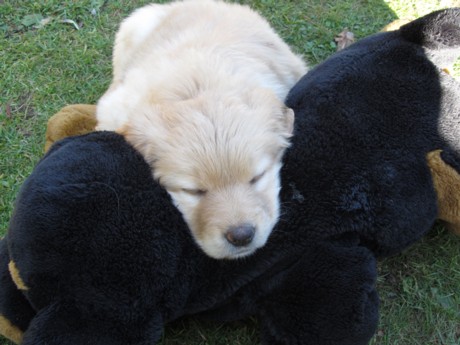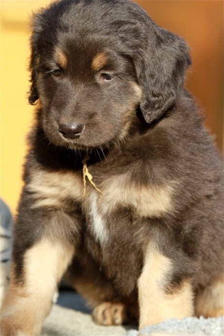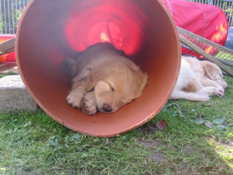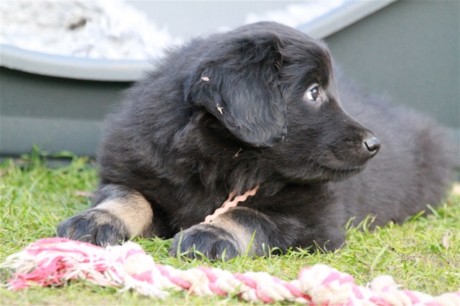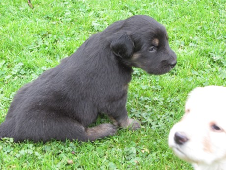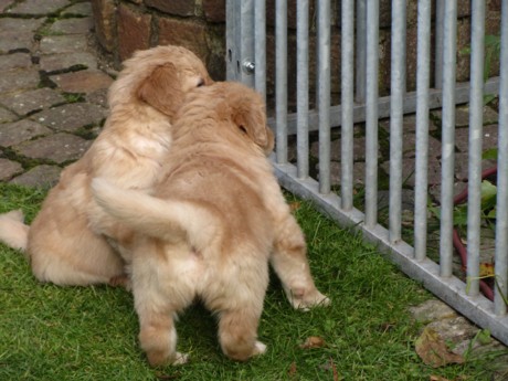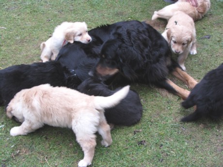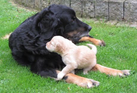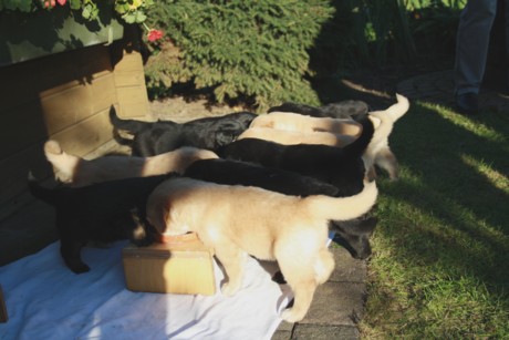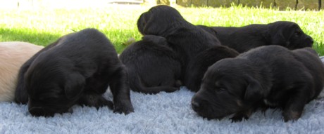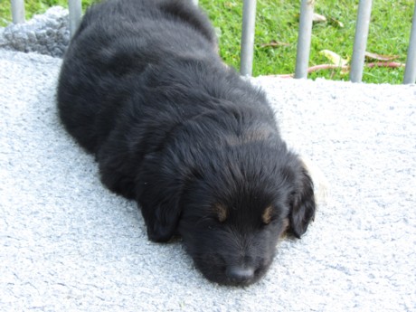 Endlich Sonnenschein! Nach einigen verregneten Tagen konnten die Welpen schließlich in ihr Gartenhaus umziehen. Unverzüglich nahmen sie ihr neues Domizil in Augenschein: einige noch zögerlich, andere schon recht mutig, doch bald fühlten sich alle pudelwohl, pardon: "hovawartwohl".Dann am Wochenende: Hochbetrieb! Papa Diego mit Linda und Gottfried waren zu Gast. Etliche der zukünftigen Familien ließen es sich nicht nehmen, Papa Diego kennen zu lernen und mit den Welpen zu spielen, bei strahlendem Sonnenschein.