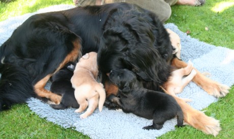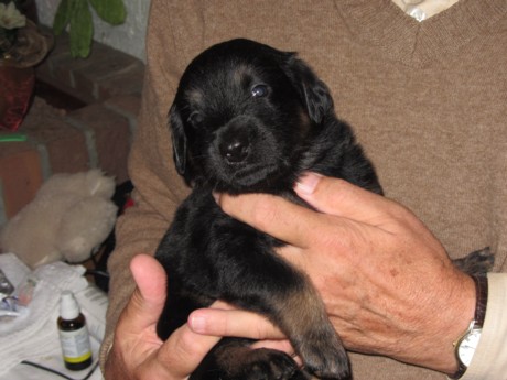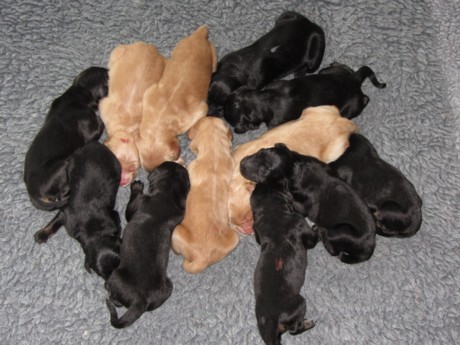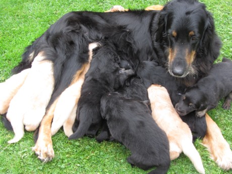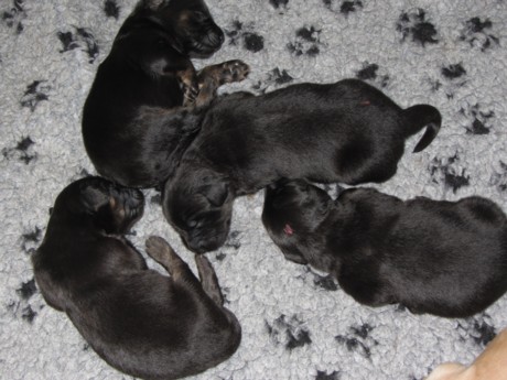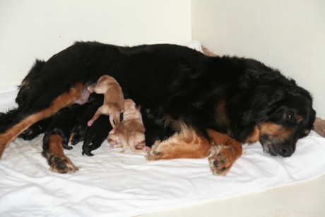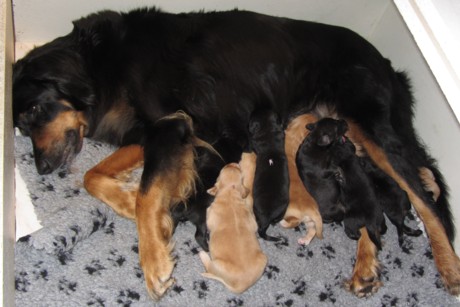 Am 15.9.2011 haben 12!!! putzmuntere, gesunde Welpen das Licht der Wurfkiste erblickt. Nach einer durchwachten Nacht mit zweistündiger "Renneritis" im Garten mit "Minipippi" und Minihäufchen zur Entleerung wurde um 12Uhr15 mittags der erste Welpe, ein schwarzmarkenfarbener Rüde, geboren. Im Abstand von einer halben bis zwei Stunden machten sich auch die anderen Welpen auf den Weg.