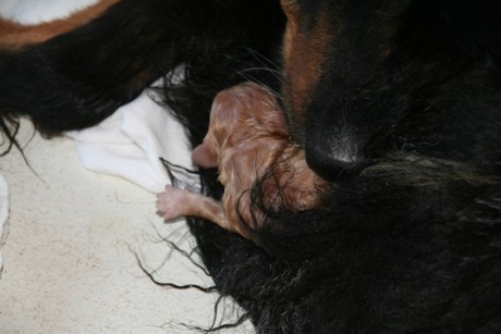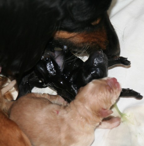 Da, wieder eine Presswehe, ein noch in den Eihäuten verpackter Welpe flutscht raus, Hanna packt ihn vorsichtig, legt ihn vor sich hin und reißt die Fruchthäute auf: eine sm Hündin, gesund und quiekend, Nummer 12. Das war´s, endlich!!