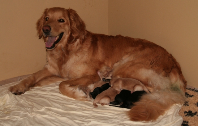 Die Geburt verlief zügig und völlig problemlos. Milva liegt entspannt in der Wurfkiste, säugt und putzt hingebungsvoll ihre Welpen. Wir sind überglücklich.