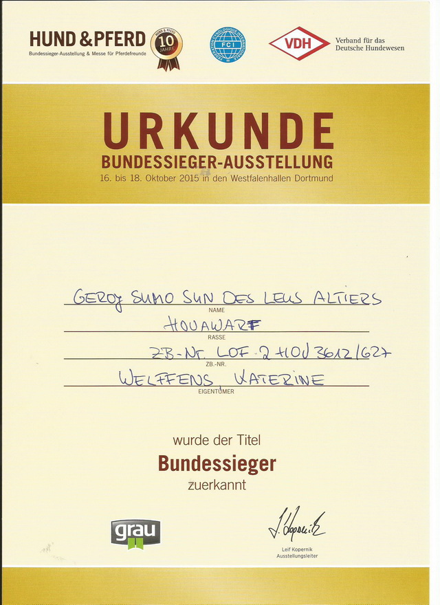 1000 - in Worten: tausend Kilometer - und eine 12-stündige Fahrzeit, natürlich von mehreren Pausen unterbrochen, aber was nimmt man nicht alles in Kauf, wenn man als Züchter den idealen Deckrüden gefunden hat: Geroj Sumo Sun des Leus Altiers.