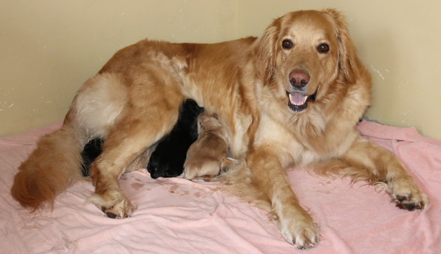 Heute (12.5.2017) ging es los, um 15 Uhr. Die Geburt verlief problemlos. Aber: Es sind vier Rüden (zwei sm, zwei bl) und leider keine Hündin. Einige Interessenten werden sehr traurig sein. Mutter und Kindern geht es blendend, wie man sieht: