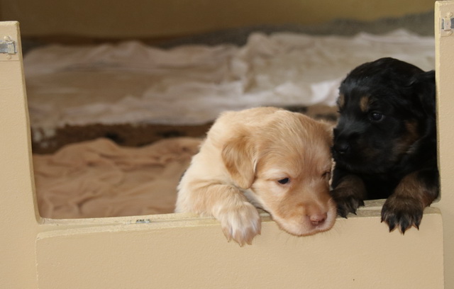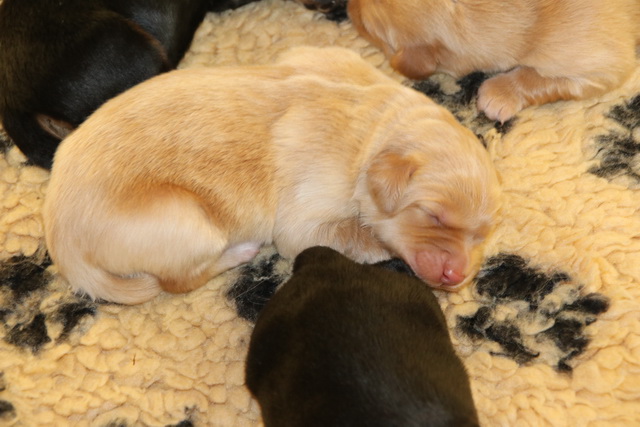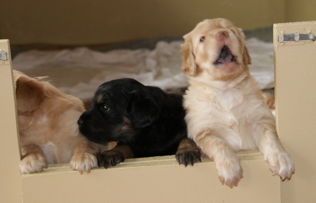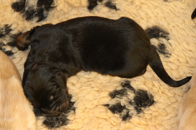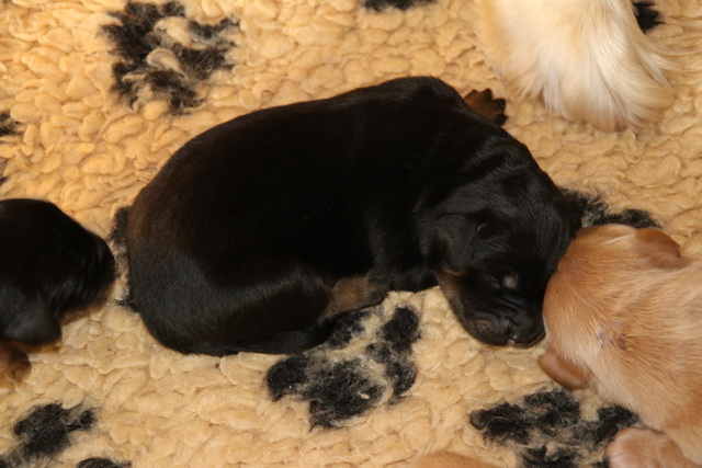 Bisher bestand die Tätigkeit der Welpen aus Trinken und Schlafen (und Wachsen).Nun kommt etwas mehr Bewegung in die Bande: